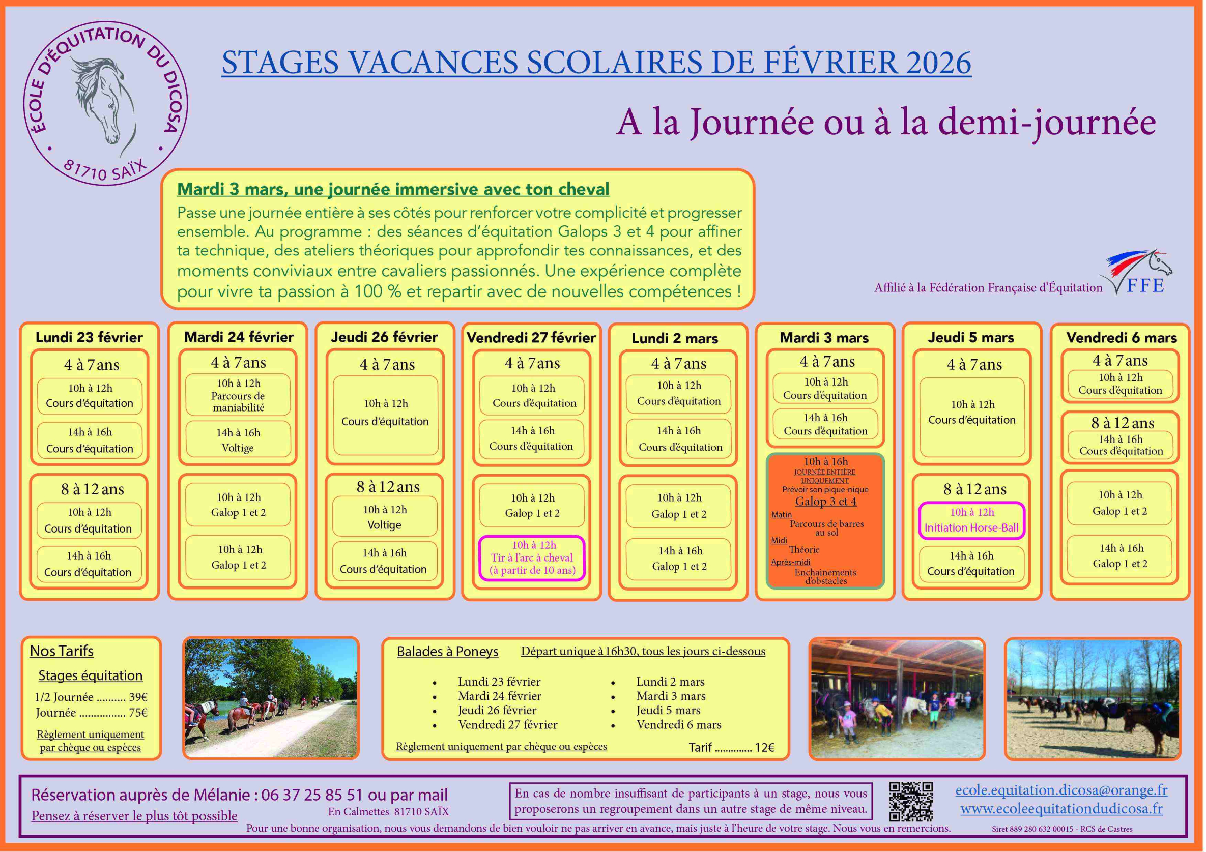 Pensez à reserver le plus tôt possible, par mail ecole.equitation.dicosa@orange.fr